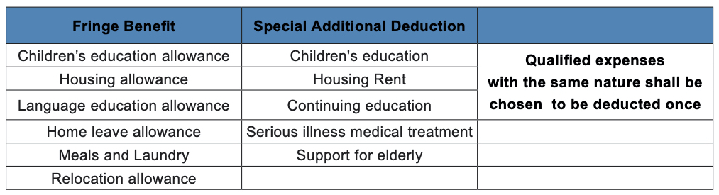 4. The application of fringe benefits and special additional deduction for expatriates